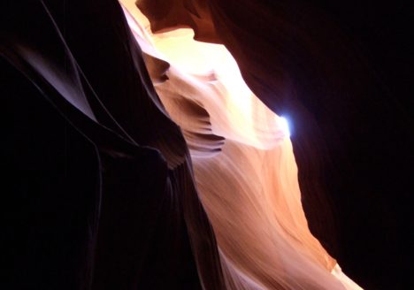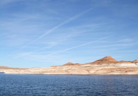 =Pageの街へ= アッパー・アンテロープキャニオンを堪能したので次のアクションを考える.時間があればレイクパウエルのボートツアーに乗りたいと思っていたので街に戻って適当なモノがあるかを探すことに. アンテロープキャニオン入り口の駐車場からは発電所の煙突3本が見えるが,ちょうど飛行機雲も3本.ついでに電線も3本.3・3・3だな,と思いシャッターを切る.